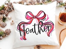 Add a sweet touch to your decor with this personalized Valentine’s Day coquette pillow. Featuring a red and pink bow, it makes a beautiful Galentine’s Day gift for your BFF or a cute accent for a bed.