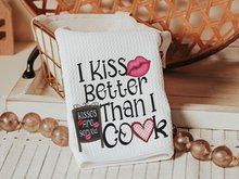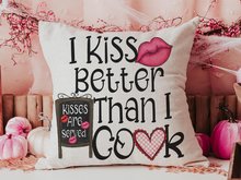 Add a fun touch to your home with an I kiss better than I cook throw pillow and a matching towel for the kitchen. Perfect for a gift for your wife or girlfriend. Whether you're celebrating Valentine's Day or Galentine's Day, this cute pillow and towel is a sweet addition to any space.